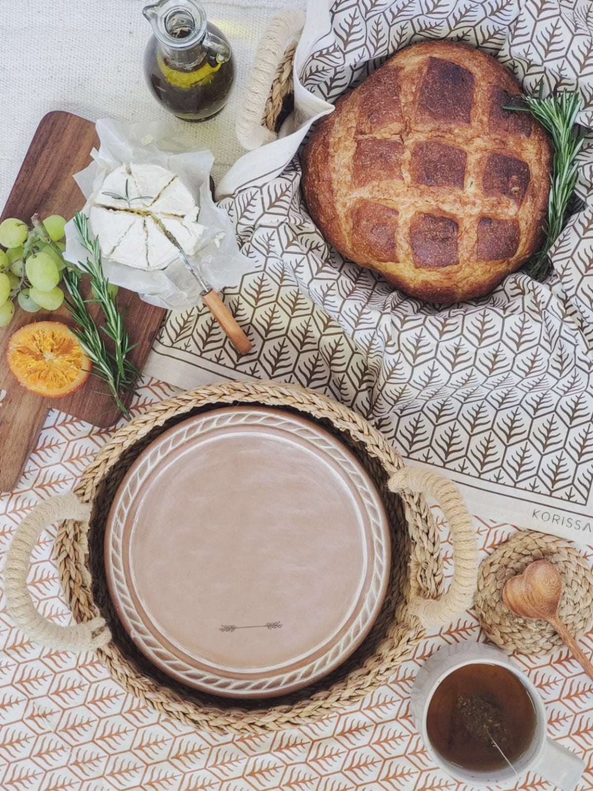 (1) Terracotta Bread warmer, (1) Seagrass basket and (1) Tea towel of your choice.